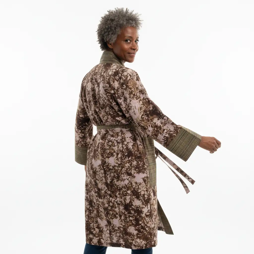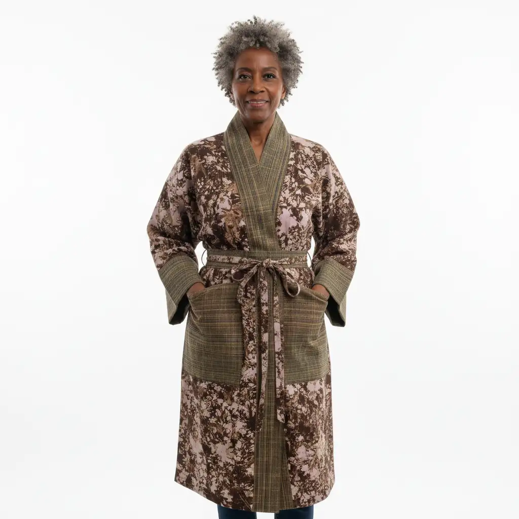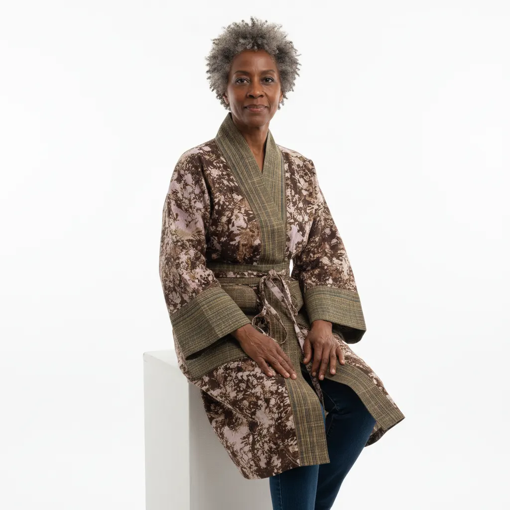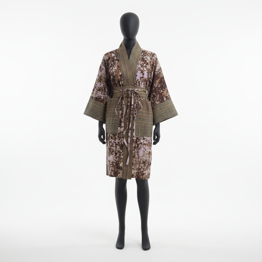 Geen twee patronen zijn identiek. Elk merkteken heeft een betekenis. Het silhouet is bewust modern. De stof is bewust traditioneel. Dit is niet zomaar een kledingstuk. Het is een brug tussen erfgoed en het hedendaagse leven. Door deze kimono te kopen, steunt u bekwame ambachtslieden wier kennis van generatie op generatie is doorgegeven.