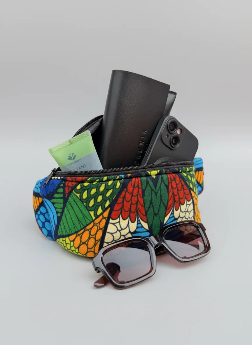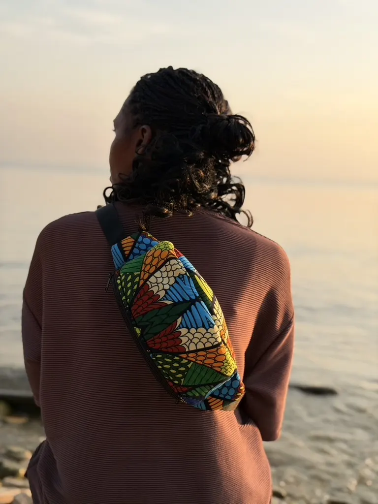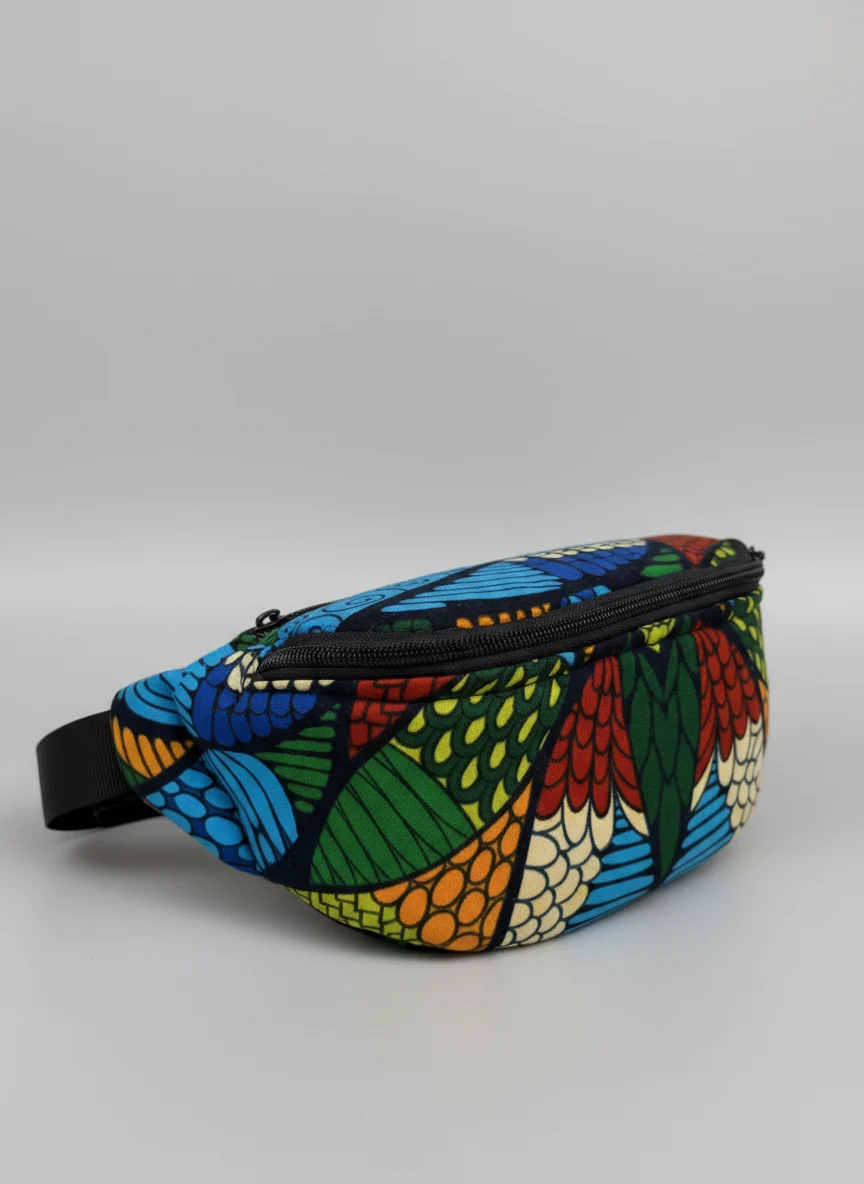 A beautiful waist bag made from African fabric. All our fabrics are hand picket in Uganda and made into different types of bags by our tailor working from Kampala. This bag is perfect for a festival or to keep your important accessories safe on a city trip. It has two pockets, one on the front and one on the backside.