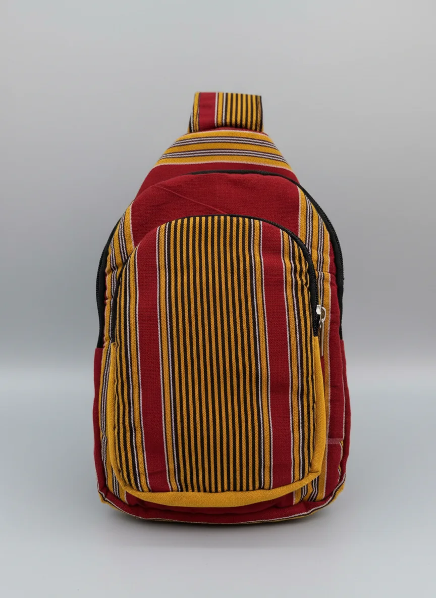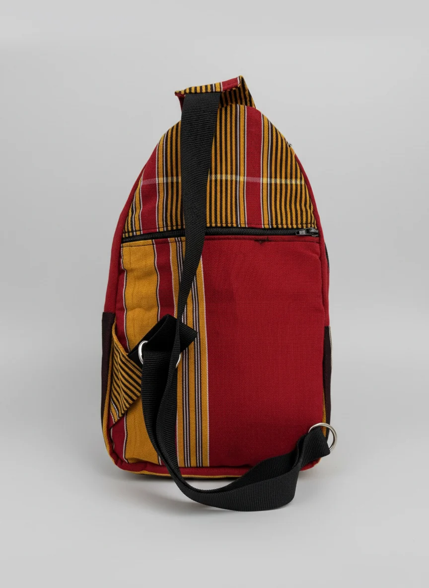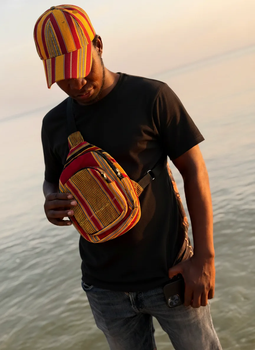 A beautiful cross body bag made from traditional Ugandan Kikoyi fabric. All our fabrics are hand picket in Uganda and made into different types of bags by our tailor working from Kampala. This cross body bag is big enough to carry all your important on a nice city trip, beach adventure or festival. It has three pockets, the main pocket, a small one on the front and a small one on the back. Style it one of our other tradition Kikoyi products for a complete look.