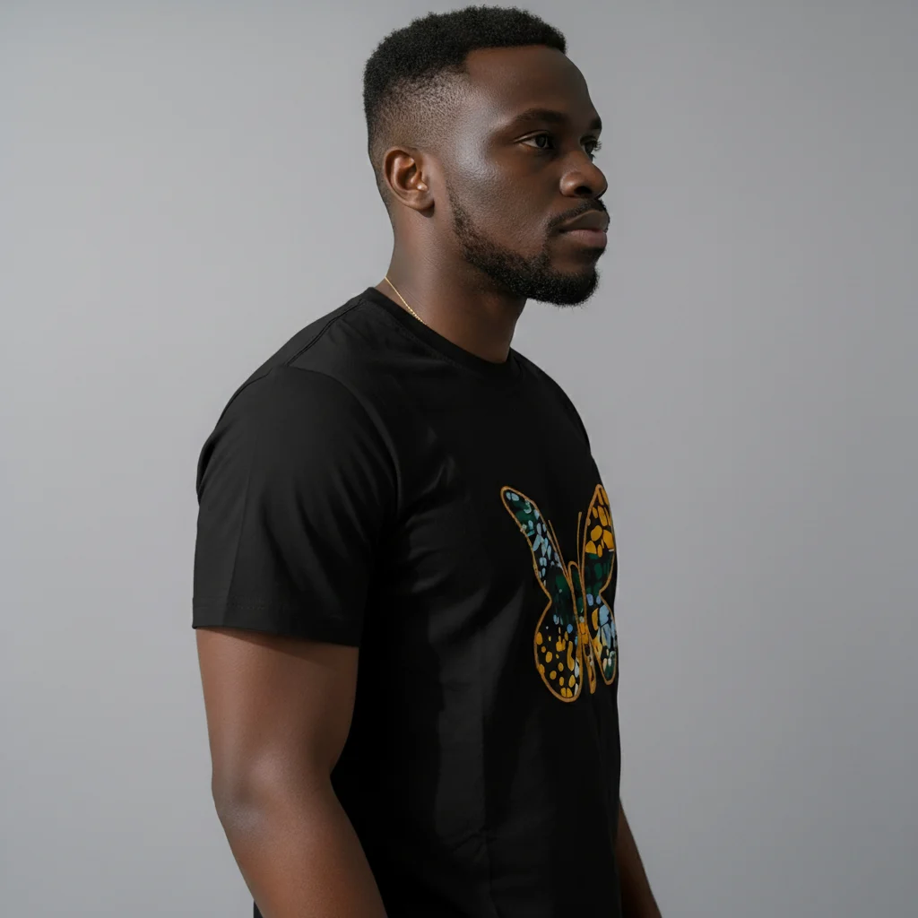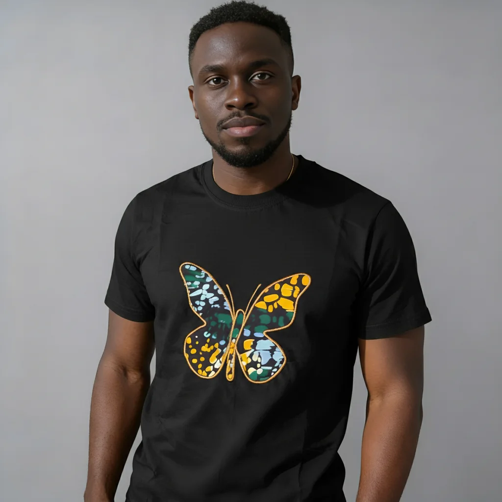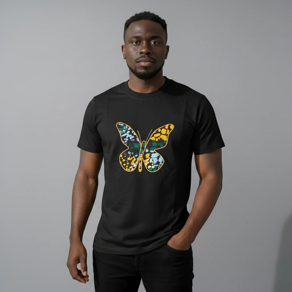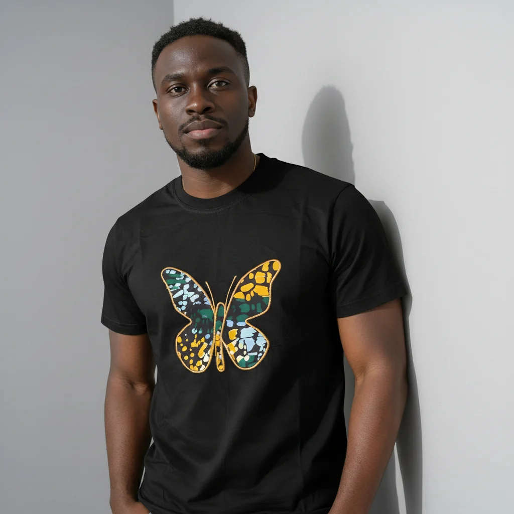 Upgrade your essential tee rotation with a touch of distinct style. This short sleeve crew neck features a unique patterned African butterfly, adding a visual interest to the classic silhoutte.